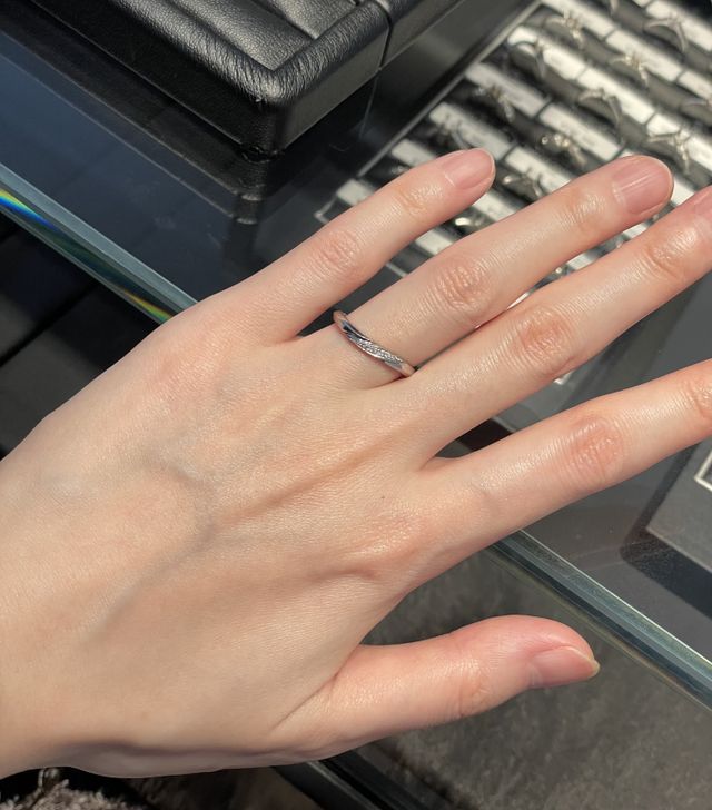 節が一番太い指のため回りやすいことと、根本の高さの違いがあるのでウェーブのデザインが似合いそうとおすすめしていただき選びました。