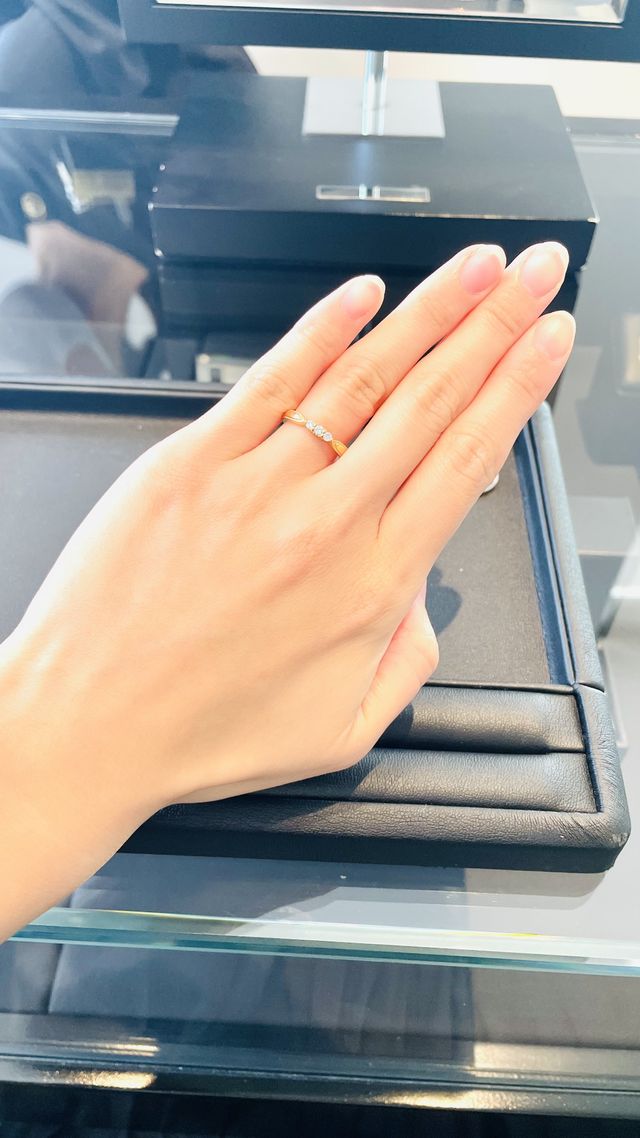 ダイヤ付きの結婚指輪を探していたところ、理想に近いデザインだったため見に行きました。厚みがあってしっかりしていたので、ボリューム感が欲しい人におすすめだと思います。ミル打ちが可愛くて華やかな印象でした。