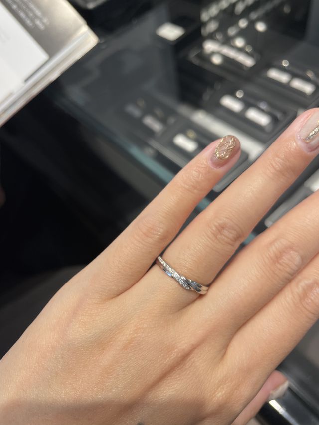 結果的に違う指輪を購入しましたが、この指輪は第二候補でした。もともとダイヤのないデザインにしようと思っていましたが、指にはめてみてキラキラしたダイヤに惚れました。3本が捻れたデザインが、自分には個性的に感じられ、他の指輪を選びました。
