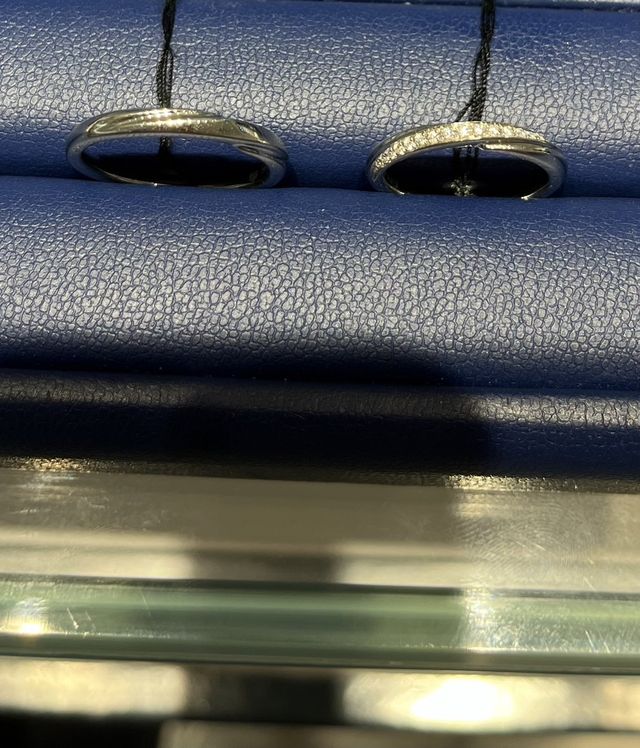 形はストレートで、デザインに動きがあるものを探していた時にスタッフの方が試着を勧めてくださいました。ダイヤモンドが斜めに施されているのに合わせて、プラチナも凹凸のある流れるデザインになっており、男性用もエレガントな印象でした。