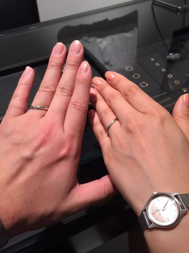 婚約指輪を選びに行ったのですか、そのまま結婚指輪も選ぶ事にしました。お揃いのデザインで、婚約指輪と重ねづけ出来き、気になっていたデザインがお互い一緒だったのが決め手になりました。彼は特につけ心地とブラックダイヤが入ったミル打ちがのデザインが気に入ったようです。