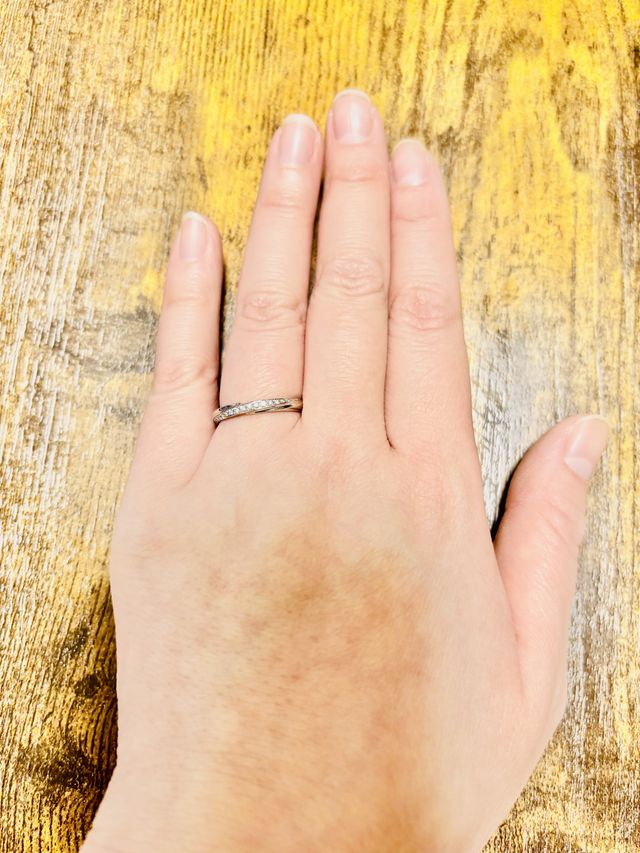 小さめのダイヤモンドがキラキラと輝いていて、かわいらしく可憐です。リングも太すぎず細すぎず、指にもフィットしてとても付けやすいので普段使いもしやすく、どのようなファッションの方にも合わせやすいと思います。