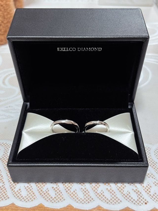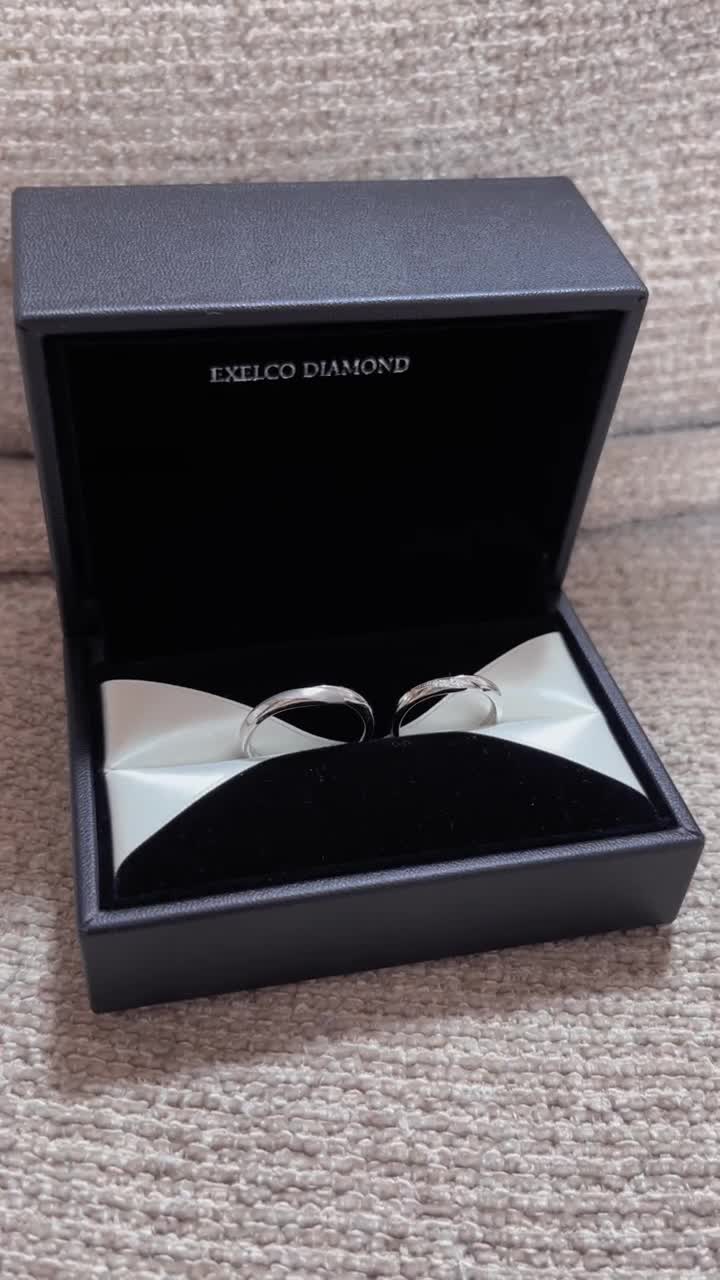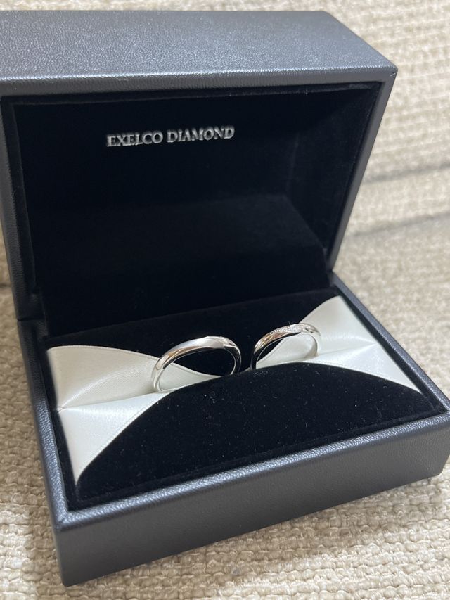 圧倒的なペアリング感(メンズとレディースの形が似ていて、おそろい感がある)とレディースリングの方は、ダイヤモンドの周りにミル打ちがあって、シンプルながらにゴージャスなデザインがとても好きです。ダイヤモンドもしっかり入ってます。