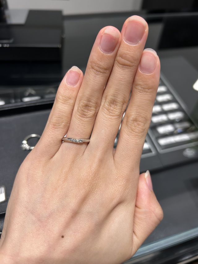 シンプルにも関わらず、ダイヤモンドの輝きとミルの細かさが個性的な、周りと被らないデザインに惹かれました。また、中央に窪みがあるため、婚約指輪のセンターリングとも相性が良く、普段使いはもちろん、特別な日にもつけたくなる素敵なリングです!