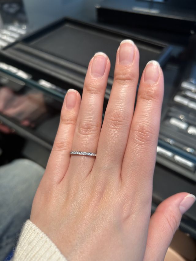 ハーフエタニティでダイヤのレベルが高いものを探していた。ダイヤの品質が高いのと、付けやすさが決め手でした。ハーフエタニティ以外のデザインも高級感があって素敵だったのでいくつか試着させていただきましたか、デザインが気に入ったのが1番の決め手です。
