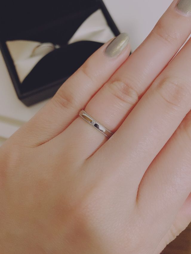 購入した指輪は全体的にシンプルですが、ミル打ちされており真ん中に小さなダイヤが入っています。しっかりインパクトもあるデザインなので気に入っています。