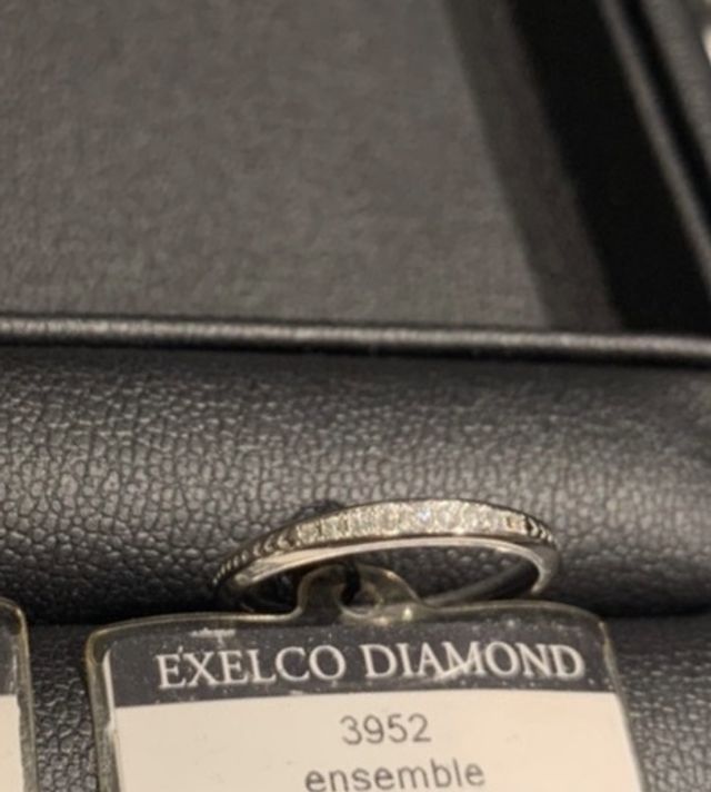 指輪の中央に、ダイヤモンドがライン状に数石並んでいます。石の数は多いですが爪留めではないため普段使いをしてもそこまで支障はないかと思います。キラキラが大好きな私にとってはとても気に入ったデザインでした。