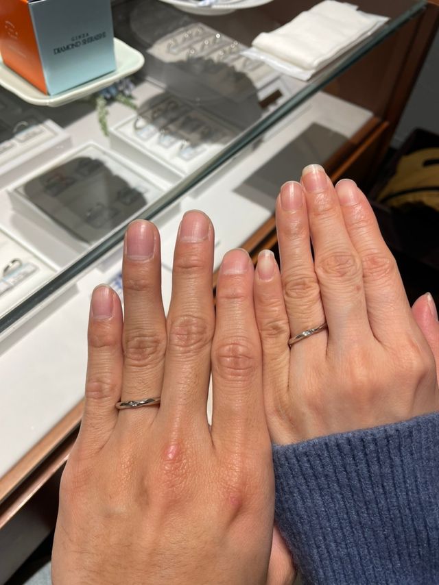 普段から身につける物なので、シンプルなデザインを探していました。ダイヤモンドの数は多くはありませんが、控えなのに、しっかり輝き、上品さがあるなと感じ、決めました。また、最近は夫婦で別々のデザインを選ぶ方も多いとお聞きしましたが、せっかくなので同じデザインの物を選びたいという思いがありました。夫婦共にデザインが気に入ったため、この指輪に決めました。