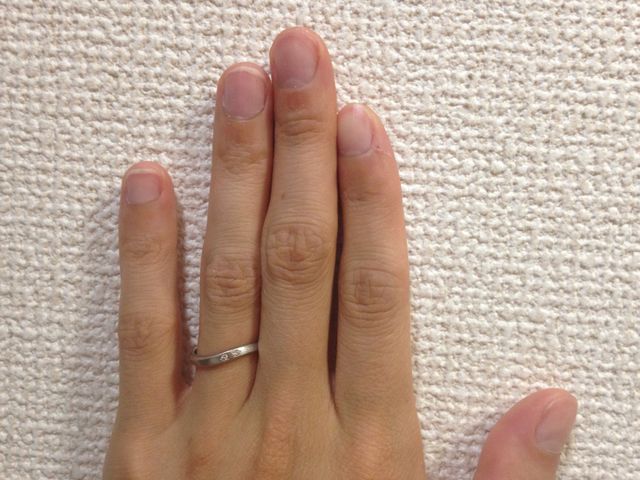 少しねじれた形なのですが、これは水かきが他の国の方に比べて大きい日本人の手に合うように作られているとのことです。また、多少関節がでこぼこしていても気にならなくしてくれます。そして、好みで選択可能なのですが小さなダイヤが2つ入っているところが気に入りました。