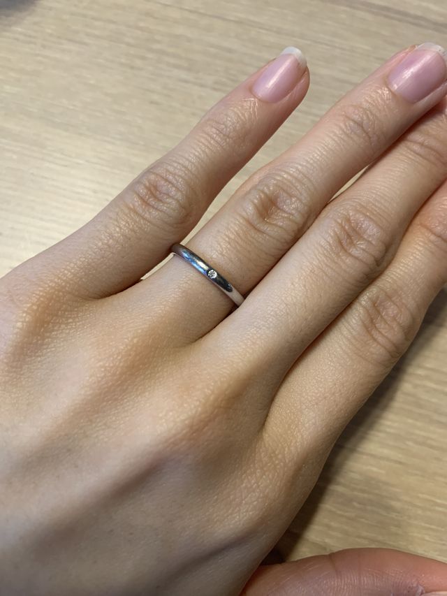 婚約指輪を旦那にこちらで買ってもらったので、同じところのが欲しいと思い目星をつけていました。ずっと着けるので、シンプルで飽きがないものにしたいと思い、1番細くてシンプルなものにしました。ダイヤも小さいのがついています。