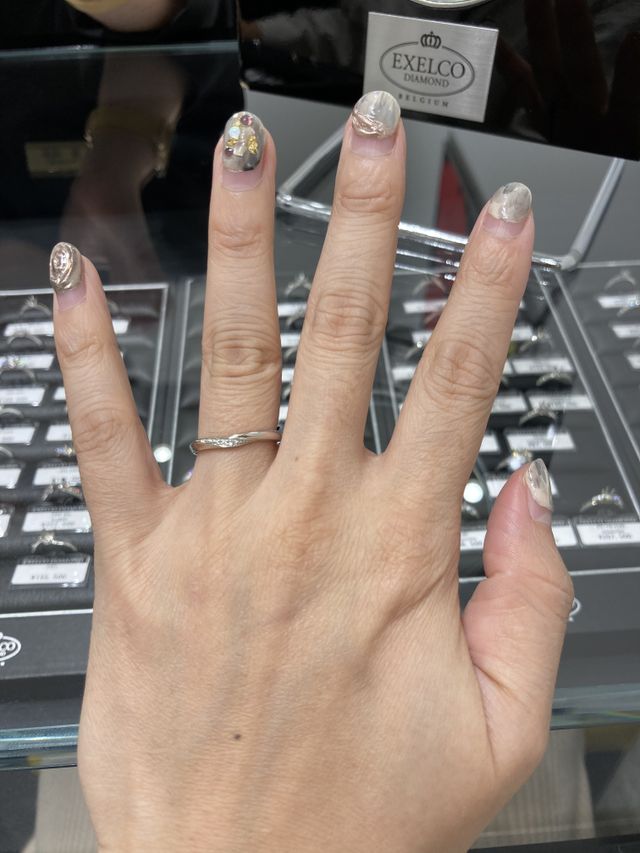 ダイヤモンドではなく、プラチナの品質や一生涯のアフターフォローに惹かれました。ダイヤがない分シンプルではあるものの一部だけ擦れのある個性的なデザイン、つけ心地も手を閉じたり開いたりして引っ掛かりがなく違和感がないものを選べました。