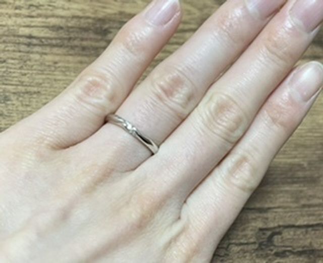 最初に私に持ってきていただいたのがこのリングで一目惚れでした。V字やウェーブを探していていろんなものを試着させていただきましたが、『唯一無二のデザイン』とお店の方が言われていた様にシンプルでいて、なかなかないデザインなのが気に入りました。
