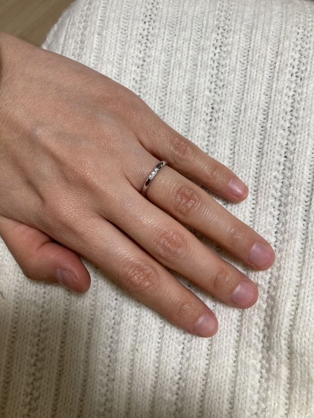 手自体が小さいこともあり、試着してみると通常より細身のリングであるほうが似合っているとパートナーとお店の人に勧められたので、この指輪を選びました。あとは少しキラッとしていると良いなと思って、ダイヤを3つつけてもらいました。