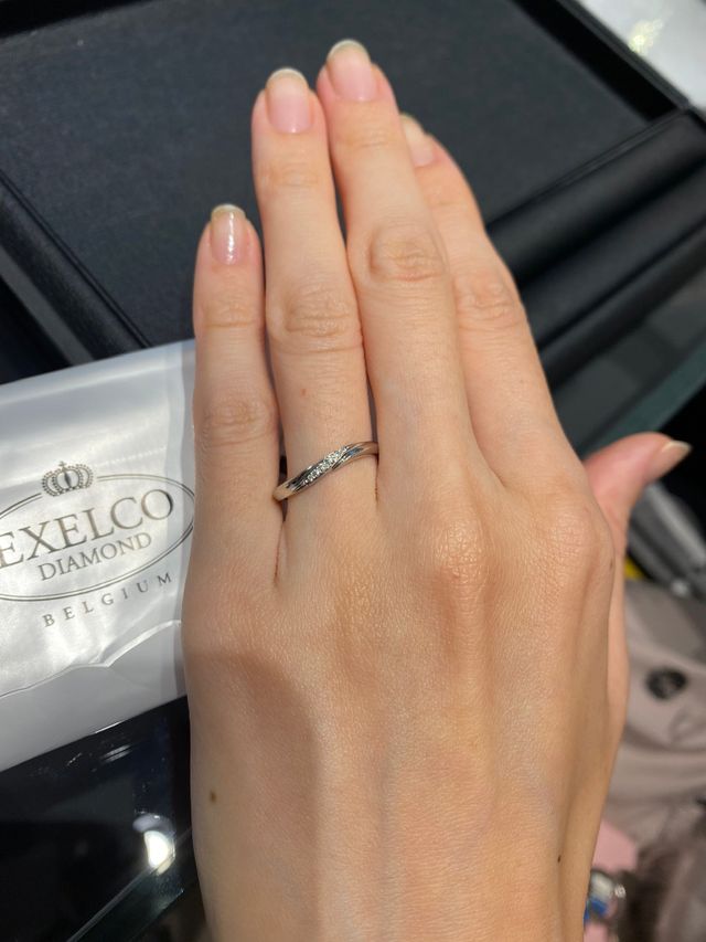 エンゲージとセットでつけられるもので試着していました。ねじれのあるデザインなので埋め込みのダイヤモンド自体は少ないですが寂しさを感じさせないデザインになっています。