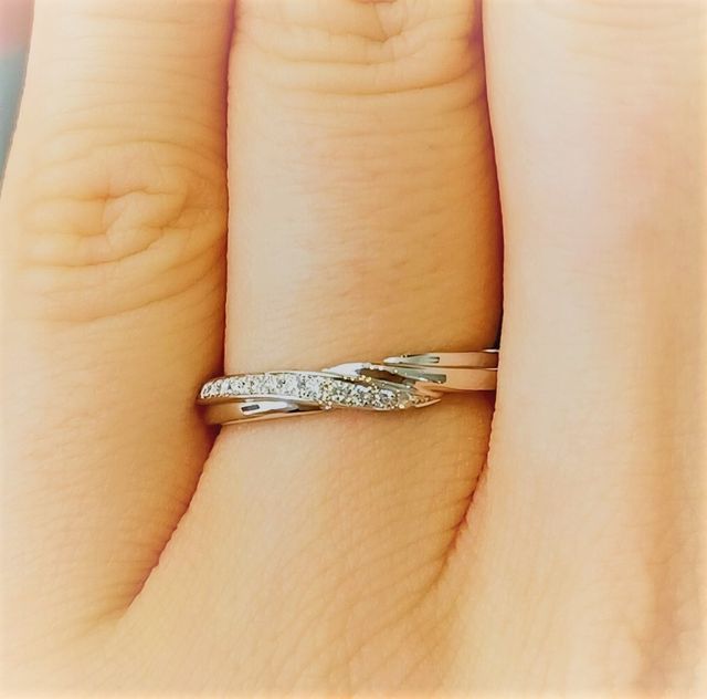 あまり見たことがない独自のデザインで、メレのダイヤモンドもほどよく入っていて素敵だし、プラチナの落ち着いた雰囲気もよく、細みの私の手にとてもおすすめですと言われてつけてみたら確かにイメージにもあったので気に入りました。