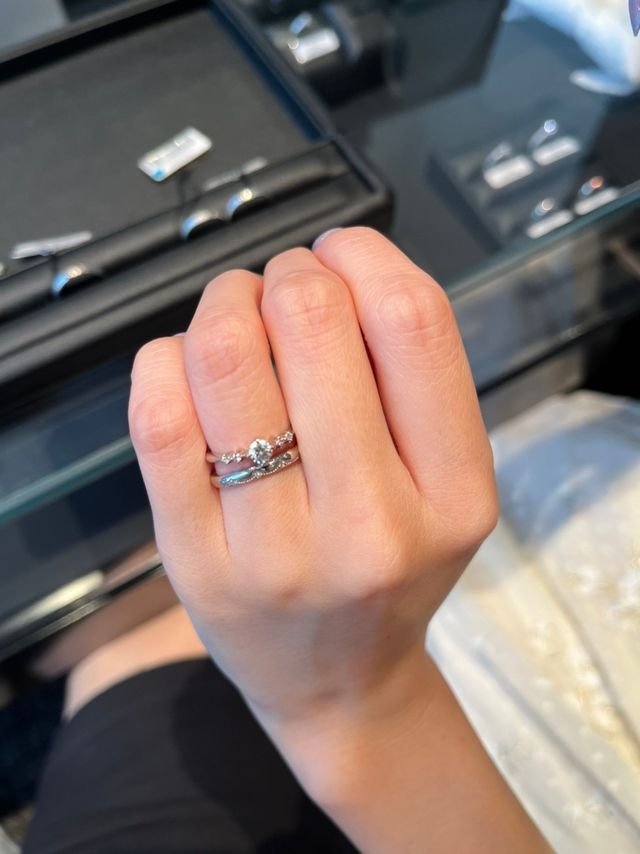 1時間半ぐらい時間をかけてゆっくり指輪を選ばせて頂けました。スタッフの方もとても親身になって話を聞いてくれたので、要望を伝えやすかったです。近くに大きな窓ガラスがあって店内がとても明るく、ダイヤモンドの輝きがとても綺麗に見ることが出来ました。