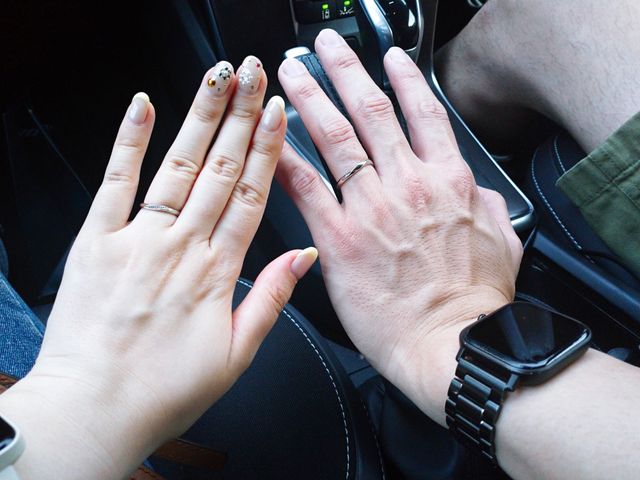 シンプルなデザインのもので、引っ掛かりがあまりないものが好みでした。もともとはストレートのデザインをイメージしていましたが、指の形を見てもらった際にウェーブの方が合うとのことで実際に着け比べをしたところやはりウェーブの方が気に入り、すぐに購入を決めました。