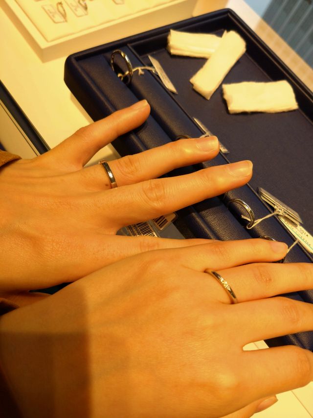 全体的にエレガント系をそろえているのかと思った。価格は平均的かと。様々なタイプの指輪を試着し、良いと思ったものを残してもらった。照明もあえて明るすぎない照明を採用しているとのことで、日常でどのくらいの輝きを放つのか分かりやすくしているとのこと。