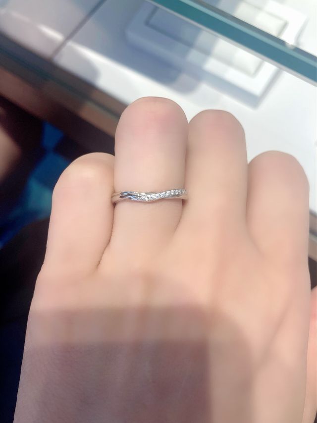 いろいろな形を試着させて貰ったのですが、少しV字になっているので動きがあって可愛くて、指が綺麗に見える気がしたのでこの形にしました。どの角度から見てもキラキラしてて可愛かったです。お値段も手頃でよかったです。
