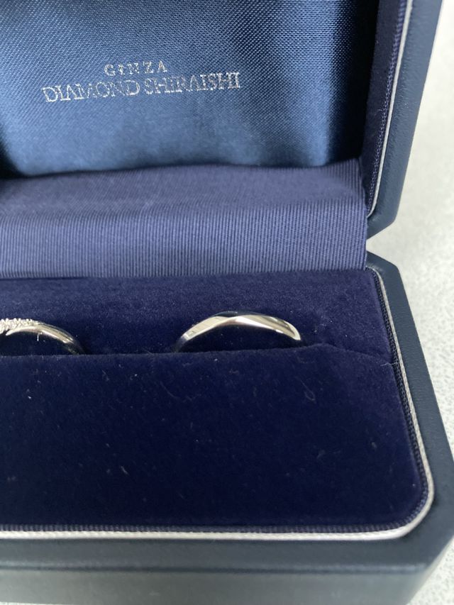 デザイン(ウェーブ型でシンプルなもの)がよく価格帯も自分たちで決めた予算の中に収まっていたから。お互いが納得がいくデザインを複数選び、実際に身につけ、お互いで確認し、形、デザイン、シルエットが1番よかった。