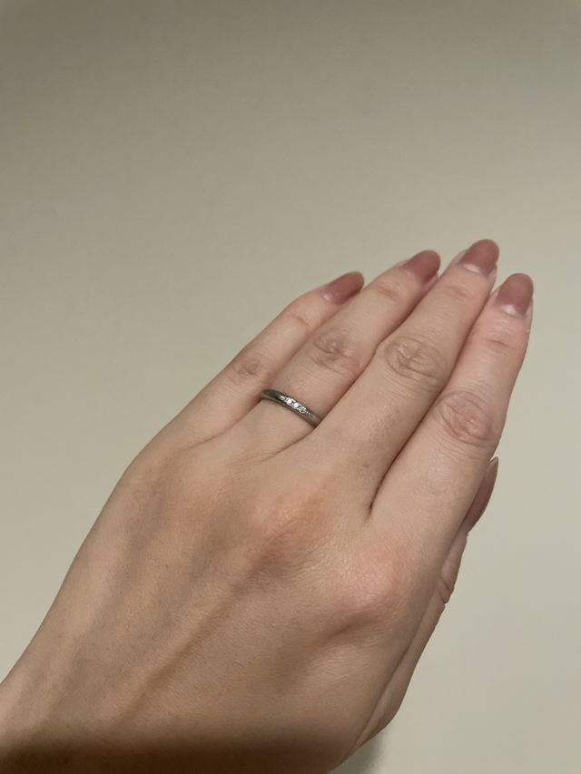 ストレートな形の中にグラデーションに並んだ3つのダイヤがシンプルかつ素敵で、指に合った形状だったのでお勧めしてもらったこともあり、決定しました。