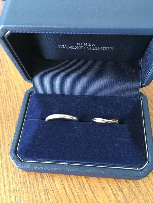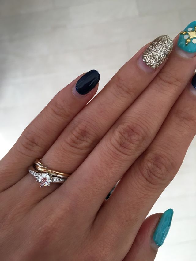 婚約指輪もこちらで買いましたが、婚約指輪はウェーブのデザインでしたし、セットリングではなかったので、重ね付けできる結婚指輪を探しつつも、少し諦めていました。なんとか重ね付けできるデザインを見つけ、また念願のコンビリングなのでとても嬉しいです。一生つけるものなので、気に入ったものに出会えて良かったです。