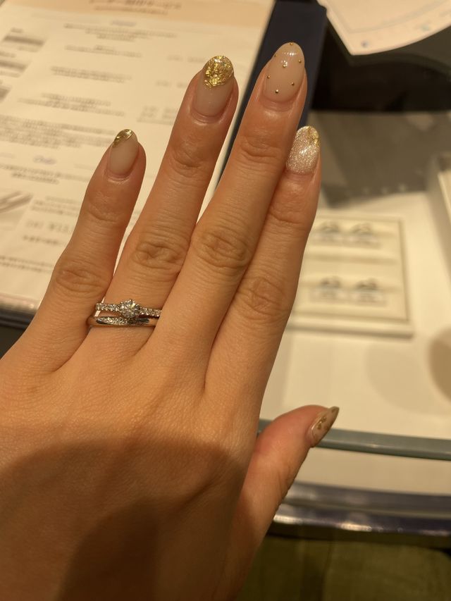 ストレートラインかVラインで迷っていましたが、スタッフの方に指の太さや長さなどから、ストレートラインが似合うと勧められました。また、bouquetにはダイヤモンドの数が多いものと少ないものがあり、カジュアルな雰囲気にも似合うので少ない方を選びました。婚約指輪と同じシリーズで重ね付けしたときにもぴったりだったので、こちらで決めました。
