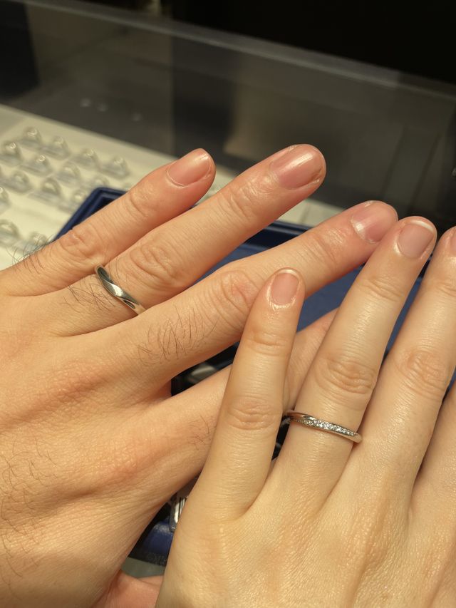 男性のものは少しねじったようなデザイン、マット加工が施されているものです。女性の方はダイヤが斜めに入っているものでした。プラチナのかがやき、ダイヤの輝きがとてもよかったです。また、つけ心地もよかったです。