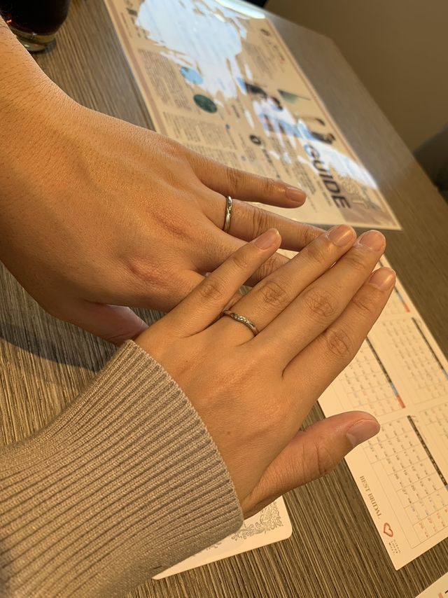 非常にシンプルで日常的につけてても気にならないデザインが良かった。ただ、シンプルすぎずマット加工などをお勧めしてくださり、非常に満足感のある指輪。内側にも文字を掘れるので、思い出として一生のものになる。