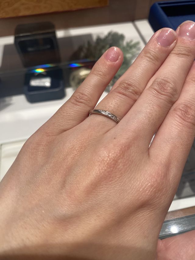 婚約指輪と同じ種類のものを購入しました。斜めにダイヤが入っており、結婚指輪だけでつけてもとても華やかで、婚約指輪とペアリングのため、セットでつけてもとてもぴったりなのが気に入りました。ダイヤとプラチナ部分にくぼみがあるので、衝撃等にも強い点が魅力的でした。