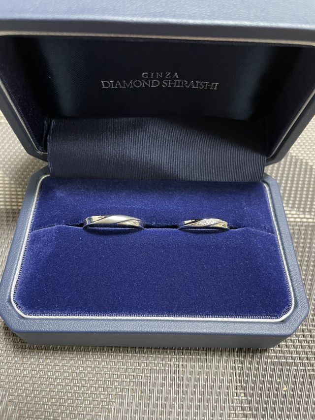 なんと言っても指輪に込められた想い「お互いを信じる気持ちを大切にする」が刺さりました。あとはほんのりウェーブがかかったデザインなので、遊び心があります。ダイヤは5個入ってますが、大きさがバラバラでそれもオシャレです。