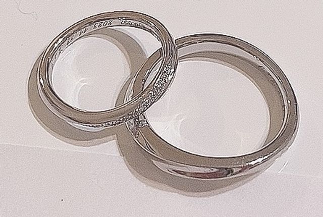 女性用の指輪は、スタイリッシュでダイヤが斜めに入っているものを選びました。どうしても1粒だと目立つのもあり、斜めに細かく入っているダイヤが良かったのでそちらにさせていただきました。