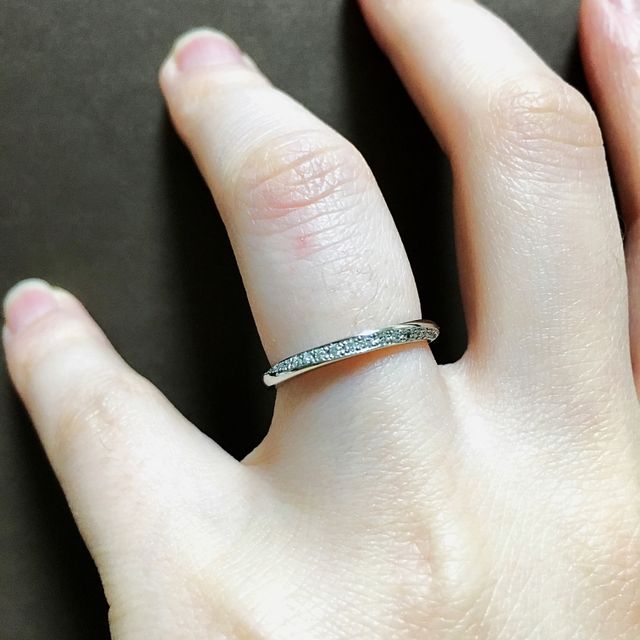 この指輪はウェーブではなく、ストレートの物にダイアモンドが斜めに入っている一見ウェーブに見える珍しいデザインとのことです。ケースの中の指輪をみて一目惚