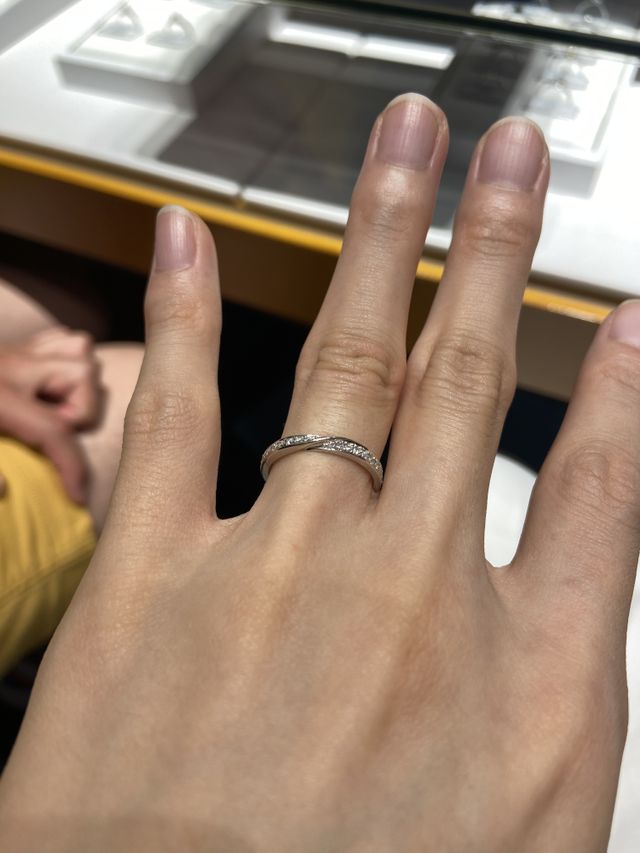 リングが細過ぎず、指の関節が太い私にも馴染む指輪でした。ダイヤが施されておりすごく華やかな印象でした。ただダイヤがあるだけでなく、捻りがあってデザイン性もあり、周囲と被らないようなデザインなところも気に入りました。