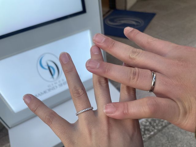 結婚指輪を購入しました。結婚指輪は彼とのペアにするか迷いましたが、エタニティリングをつけた瞬間これにしようと決めました!手元がキラキラしているので毎日見るたびに明るい気持ちになります。洗練されたデザインでとても気に入っています。