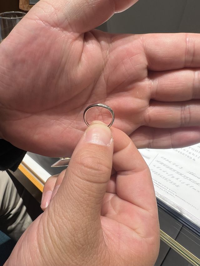なにより担当者の接客が心地良かった。あまり押しが強いと圧を感じることがあるが、程よい押しと私と夫のどちらの意見もしっかり聞いて指輪選びのアドバイスをくれたのが嬉しかったです。また、指の角度を測ってから指輪選びをしてくださったので、お互いにどの指輪が合うのか似合うのか論理的に説明してくれたのがわかりやすかった。