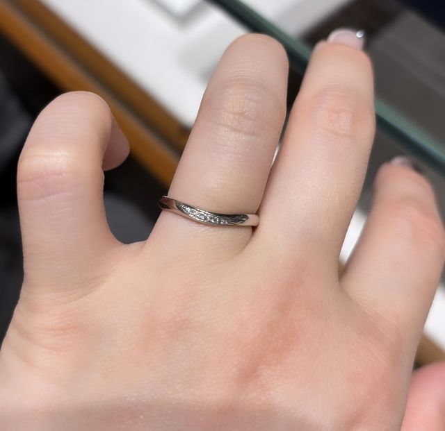 シンプルで控えめだけどダイヤモンドの輝きが綺麗に見えるデザインに惹かれました。緩やかなU字のようなV字で、指の形がすごく綺麗に見えます。値段も、他の物に比べてお手頃なのかなと思います。飽きのこないデザインだと思います!