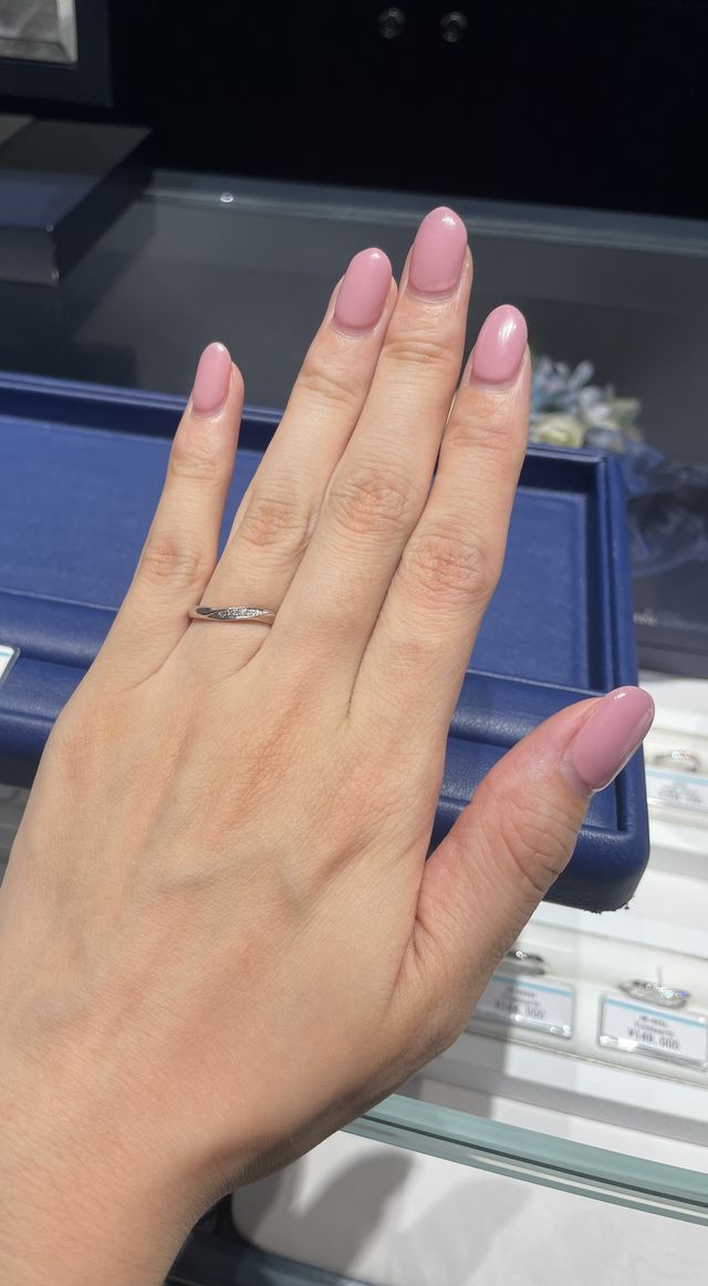 シンプルかつ、長く使えるデザインでとても気に入りました。初めはダイヤモンドなしで考えたのですが、ダイヤモンドシライシさんはダイヤモンドにかなりこだわりのお店だったので、せっかくだと思い、ダイヤモンド入りの指輪に決めました!