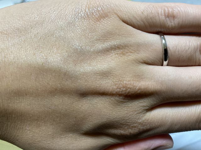 重くなく、シンプルでつけやすいと思います。そもそも色々な種類があり、迷っていましたが、辞書サイズのカタログをもらい、そこからこういった形の指輪がいいとか、自分たちの好み、要望を取り入れた結果、この指輪になりました。店員さんから値段が安いやつから順に紹介されていたと思います。