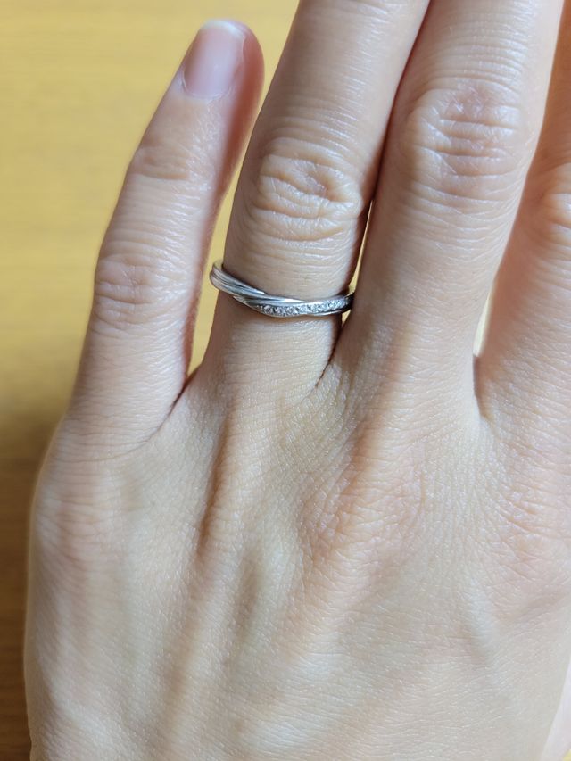 ゆるいV型で、指がナチュラルに綺麗に見えるところと綺麗なダイヤモンドに一目惚れしました。当初は、シンプルなウェーブと考えていましたが、ダイヤモンドの輝きがとても綺麗で、迷わずこれに決めました。シンプルすぎず、派手すぎず飽きないデザインです。羽のような形で指が優しい印象になります。指輪をつける位置によっては、ウェーブにもなり、正面にするとVになり、指輪が回っても綺麗に見えるのでお気に入りです。ダイヤモンドが並んでいるため、一年経過しましたが指輪の傷が目立ちにくくそこもよかったです。旦那とペアで同じデザインを探していたので、お揃いにできたことと、お互いに気に入ったデザインが一致して購入できたことに満足しています。日常でキラキラが目に入るとこの指輪のおかげで、気分が上がります。