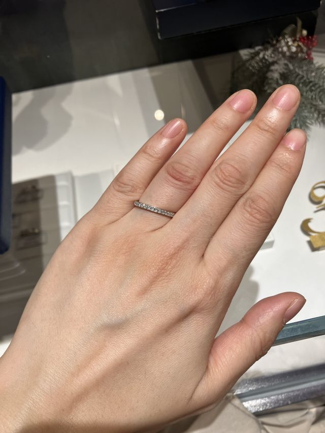ハーフエタニティで検討しており、試着しました。ダイヤは綺麗だと思います。デザインはシンプルです。お値段もそれ相応で、それなりの金額ですが、高すぎるほどではありませんでした。即決するほどの決め手はありませんでした。
