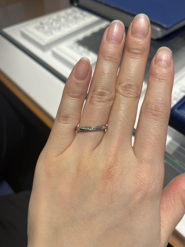 ストレートに斜めにダイヤモンドがあしらわれたデザインが好みでHPから見た時からお気に入りのデザインでした。ダイヤモンドの主張が強すぎず、控えめにキラッと輝くデザインに惹かれました。ペアでつける指輪もペア感がありシンプルで普段使いできそうなデザインでした。