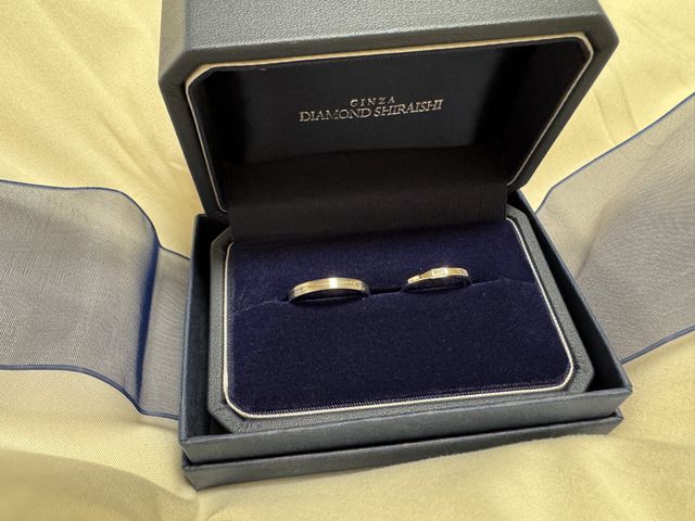 女性側の指輪は、エメラルドカットのダイヤモンドが個性的で気に入ってます。
