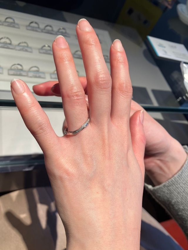 ダイヤモンドが斜めに入っているものが欲しくて試着しました。ダイヤモンドが多く、キラキラしている点が気に入りました。刻印の種類も豊富な点がすごくよかったと思います。