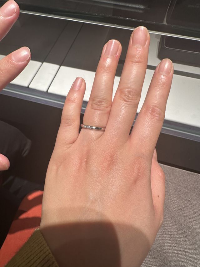 最初はダイヤなしのストレート、シンプルなものを探していましたが、画像の物を試着させていただいた時に3石ほどついているのにギラギラ感がないダイヤの輝きが、とても素敵で惹かれました。着け心地がよくて手にフィットしました。