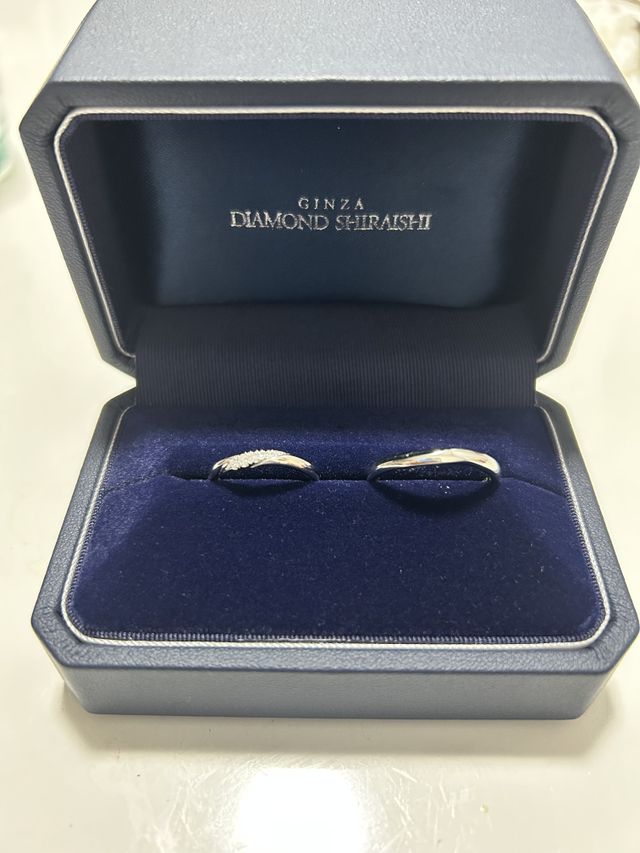 握り心地がよく、普段アクセサリーをつけない方も違和感なくつけられるかと思います。少しウェーブがあり、指がキレイに見えるデザインです。女性の方の指輪はダイヤモンドが埋め込み式で、唯一のデザインという点も魅力的でした。