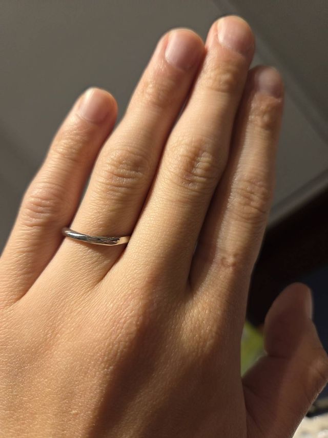 シンプルでありながらも少しウェーブがかかっているデザインです。パートナーのリングと同じモデルで、好みが一致したためこちらにしました。シンプルで真っ直ぐすぎないデザインで主張も激しくなく普段使いしやすいと思います