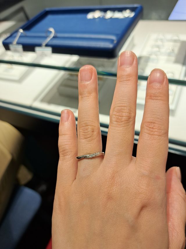 メレダイヤがあしらわれたデザインなのですが、ただ直線的にダイヤが配置されているのではなく、少しひねりが入っているところが気に入りました。すこしウェーブになっている方がデザイン性かあるし、指が綺麗に見える気がします。