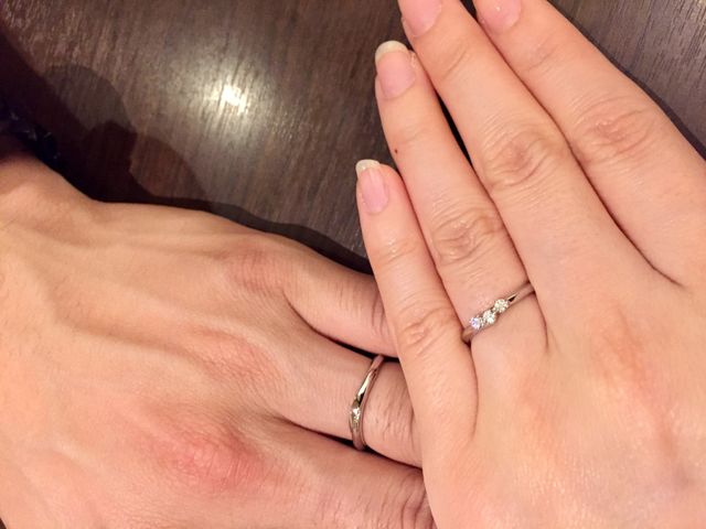デザインとつけ心地がとてもよかった。ダイヤモンドの輝きも、プラチナ純度も満足のいくもので、すごく気に入りました。ダイヤモンドも、3つ並んでいて存在感があり、私の指にぴったりでした。インターネットで、画像をみて気に入り、店舗に行って実際にはめてみて、本当に運命のひとつで、即決めでした。