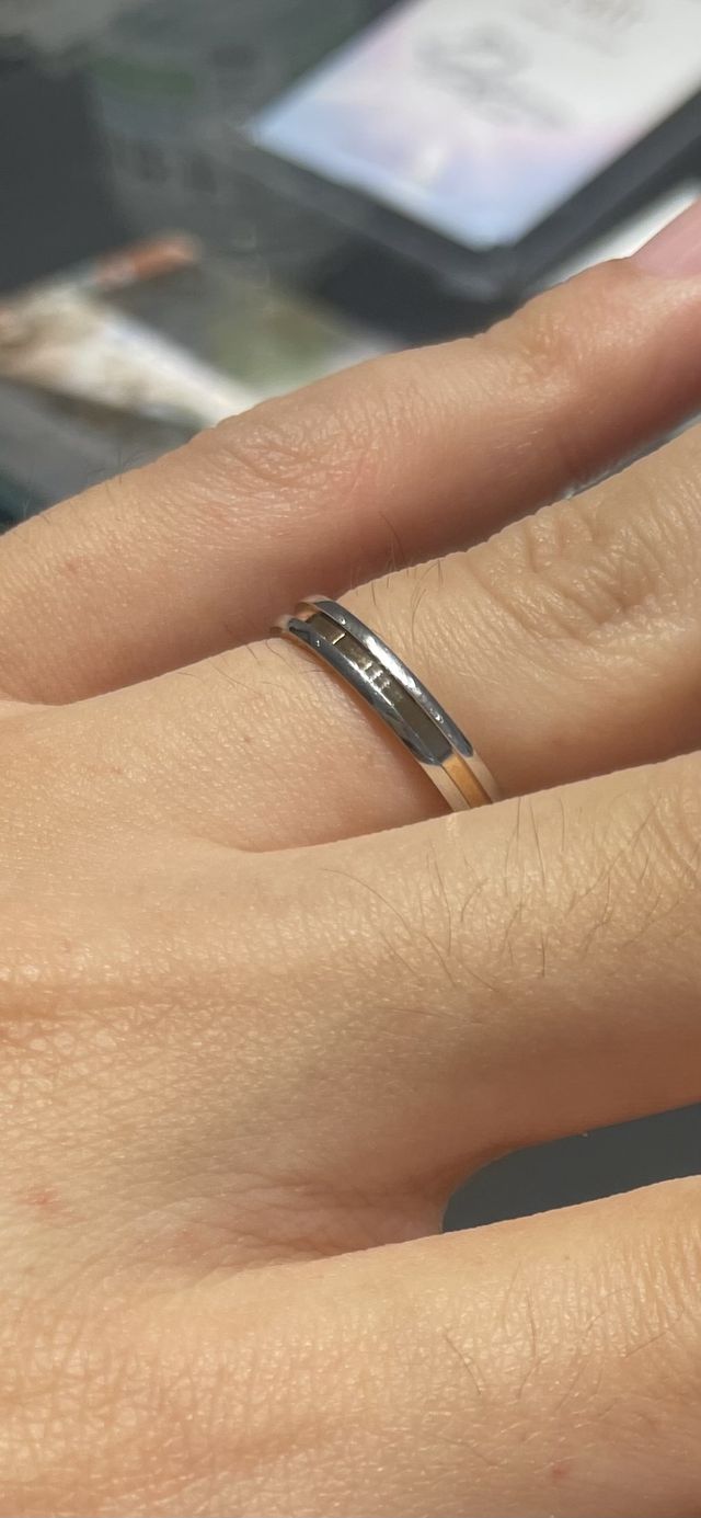 プラチナの間にゴールドのラインが挟まれており、珍しいデザインでとてもオシャレです。プラチナの部分をマット加工に変更できるとのことでした。全てゴールドは仕事中に着けにくいかなと思いますが、ゴールドも楽しみたい人におすすめです。